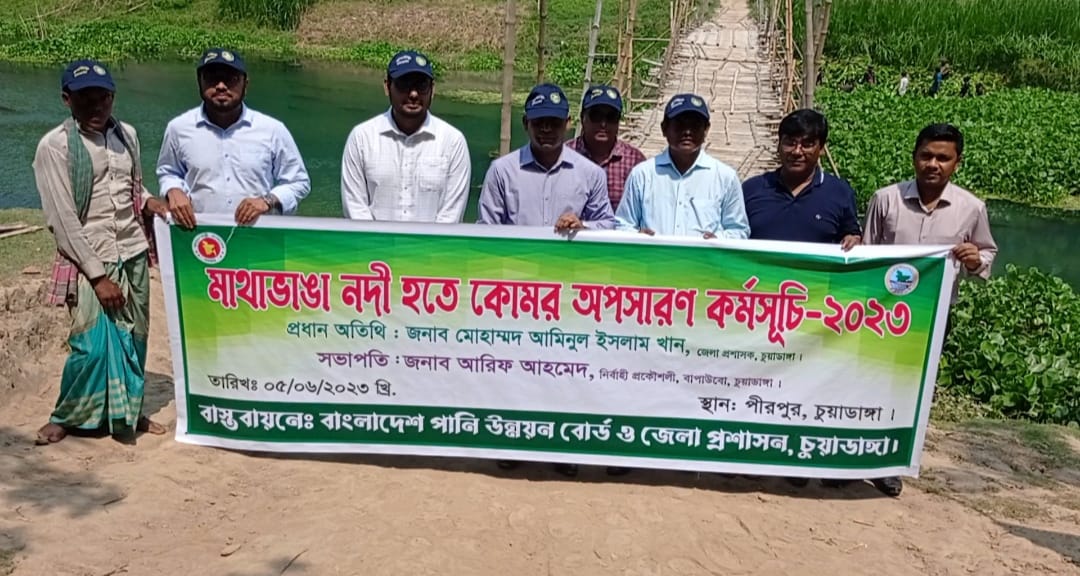 আজ ৫ জুন সোমবার বিশ্ব পরিবেশ দিবস উপলক্ষে চুয়াডাঙ্গার মাথাভাঙ্গা নদী থেকে কোমর বাধ ও কচুরিপানা অপসারন কার্যক্রমের শুভ উদ্বোধন করা হয়। নদীকে অবমুক্ত করে নদীর চলমান ধারা অব্যহত রাখতে বাংলাদেশ পানি উন্নয়ন বোর্ড চুয়াডাঙ্গার আয়োজনে চুয়াডাঙ্গার উপর দিয়ে বয়ে যাওয়া একমাত্র মাথাভাঙ্গা নদীতে অবৈধ কোমর বাধ ও কচুরিপানা অপসারনের কাজ শুরু হয়েছে। অবৈধ কোমর বাধের কারনে জমে থাকা কচুরিপানায় ছেয়ে ছিলো মাথাভাঙ্গা নদীটি। নদী তার নিজের রুপে ফিরে আসবে এটা ভুলেই গিয়েছিলো স্থানীয় জনসাধারণ। তবে বাংলাদেশ পানি উন্নয়ন বোর্ড চুয়াডাঙ্গা ও জেলা প্রশাসকের সম্মিলিত প্রচেষ্টায় শুর হলো কোমর বাধ ও কচুরিপানা অপসারন কার্যক্রম। কিছু অসাধু ব্যক্তি দীর্ঘদিন ধরে নদীতে কোমর বাধ দিয়ে নদীর ভারসাম্য বিলুপ্ত করে আসছিলো। যাদের কারনে সাধারন মানুষ নদীর মাছ খাওয়া থেকে বঞ্চিত। এমন কি নদীতে গোসল করার মতো অবস্থা ও আর ছিলোনা। নদী অবমুক্ত হবে শুনে সাধারন খেটে খাওয়া মানুষ খুব খুশি। বাংলাদেশ পানি উন্নয়ন বোর্ড চুয়াডাঙ্গার আওয়োজনে আজ ৫ জুন সোমবার সকাল ১০ টার সময় উদ্ভদনের মাধ্যমে শুরু হয় এই অপসারনের কাজ। প্রায় ৫ কিলোমিটার এরিয়া জুড়ে নদীর অবৈধ কোমর বাদ অপসারনের কাজ শুরু হয়েছে। চুয়াডাঙ্গা সদর উপজেলার চুয়াডাঙ্গা ব্রীজ থেকে পীরপুর ব্রীজ পর্যন্ত মাথাভাঙ্গা নদী হতে কোমর অপসারণ কার্যক্রমের শুভ উদ্ভোধন করা হয়। উদ্ভদন করেন চুয়াডাঙ্গা জেলা প্রশাসক মোহাম্মদ আমিনুল ইসলাম খান। উদ্ভদনী অনুষ্ঠানের সভাপতিত্ব করেন, চুয়াডাঙ্গা পানি উন্নয়ন বোর্ডের নির্বাহী প্রকৌশলী, আরিফ আহমেদ । এসময় তিনি মাথাভাঙ্গা নদী হতে কোমর ও কচুরিপানা অপসারণ কার্যক্রম অব্যাহত রেখে একটি সুন্দর ও পরিচ্ছন্ন মাথাভাঙ্গা নদী চুয়াডাঙ্গাবাসীকে উপহার দেওয়ার দৃঢ় প্রত্যয় ব্যক্ত করেন। কর্মসূচিতে আরো উপস্থিত ছিলেন উপজেলা নির্বাহী অফিসার শামিম ভুঁইয়া, চুয়াডাঙ্গা সদর; সহকারী ভূমি কমিশনার মাজহারুল ইসলাম , চুয়াডাঙ্গা সদর; জেলা মৎস্য কর্মকর্তা প্রদিপ কুমারসহ পানি উন্নয়ন বোর্ড, চুয়াডাঙ্গা দপ্তরের উপ-বিভাগীয় প্রকৌশলী, উপ-সহকারী প্রকৌশলী সে সময় উপস্থিত ছিলেন। এবং বাংলাদেশ পানি উন্নয়ন বোর্ড চুয়াডাঙ্গার সকল কর্মকর্তা কর্মচারী বৃন্দ ও সে সময় উপস্থিত ছিলেন।